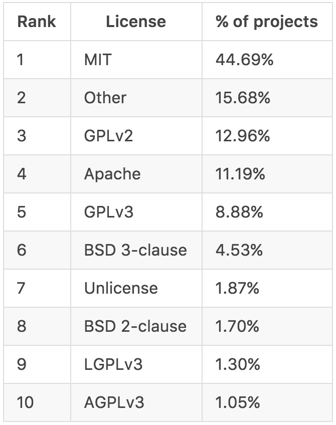 所以说,当时业界就已经有对 Apache 和 MIT 许可证的倾向趋势了。2015年 GitHub 许可研究也发现,MIT 许可证已成为最主要的一个选择。 在我的 XPRIZE 工作和作为社区顾问的工作中,我也看到了一个类似的现象,许多客户对于用 GPL 许可他们的代码表示不舒服。