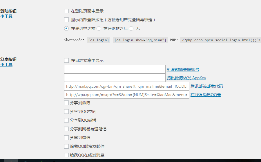- 支持自定义:登录前后及分享的代码和短代码、统一的回调地址、注册界面样式