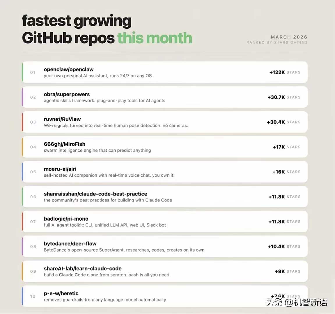 Top 10 全是AI智能体/工具向项目,OpenClaw 狂揽122K星断层第一🔥