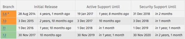 有些人将这种情况描述为 PHP 定时炸弹。 较新的 PHP 7.0 将不再在今年12月1日的 EOL(生命周期结束)提供安全支持。 即便是版本 7.1 也将于12月1日终止。一年后结束安全支持。