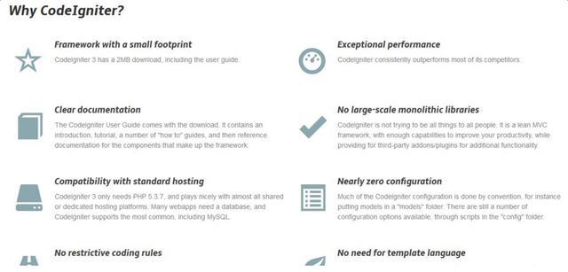 CodeIgniter是很小的框架。仅有2M大小,包括用户指南。CodeIgniter 3只需要PHP 5.3.7,并且几乎与所有共享或专用的托管平台匹配。许多webapps需要一个数据库,CodeIgniter支持最常见的,如MySQL。用户使用自己的编码和命名规则,只有几个处理classname冲突的注意事项。