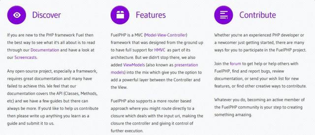FuelPHP是一个简单,灵活,社区驱动的PHP 5.3+框架。FuelPHP是一个MVC(模型 – 视图 – 控制器)框架,从根本上设计出来,可以完全支持HMVC作为其架构的一部分。FuelPHP还将ViewModels(也称为演示模型)添加到组合中,可以选择在Controller和View之间添加强大的层。