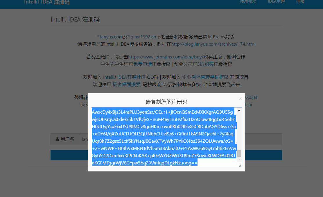 第二步:打开网址:http://idea.qinxi1992.cn/ 注册时选择“使用注册码”输入如下字符, 点击“OK”快速激活JetBrains系列产品
