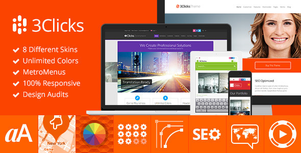 3Clicks WordPress主题是一个企业、作品展示主题,特点:4个预置的皮肤,自适应(响应)设计和视网膜支持,兼容FireFox, Safari, Chrome, IE8, IE9, IE10,无限颜色,强大的选项面板,多个博客和作品展示布局,WPML 支持,多种菜单,11个自定义页面,6个幻灯片类型,博客文章格式支持,作品筛选支持,花式简码等。