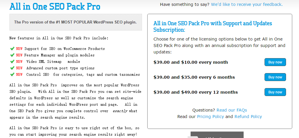 注意的是All in One SEO Pack Pro 是高级版本,不是你在wordpress插件库搜索到的免费版本。高级版本强大功能多的多。当然