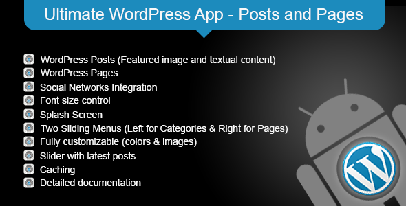 WordPress的帖子(特色图片和文字内容) WordPress的页面 社交网络整合 AdMob的,迁移到谷歌播放服务 字体大小控制 闪屏 两个滑动菜单(左侧为分类,右为页) 完全可定制(颜色和图像) 滑块与最新的帖子 缓存 详细资料 (新)下拉刷新