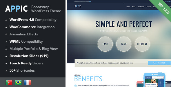 Appic是建立与引导响应平坦,干净,多用途的WordPress主题。它可以用于你的企业网站或任何其他类型的应用程序。
