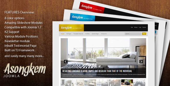 Asongkem简单,现代,观赏壮丽的Joomla模板。专为满足对多种经营项目。 Asongkem配备了功能强大的T3 Joomlart框架,最好选择一些推广。