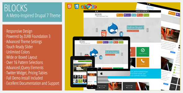 Blocks是metro风格,充分响应的Drupal7主题搭载 ZURB Foundation 3.它采用了最新的HTML5,CSS3和jQuery的先进技术,以提供一个真正独特的主题,将哇你的听众。块包括功能强大的主题设置,使您可以快速,轻松地配置您的网站。该网页提供了几个定制部分,包括图像滑块,你可以用它来突出你的网站的重要方面。有无限的色彩可能与8种预定义的配色方案而来,淡淡的准备滑块来选择,图像组合模板,为伟大的小部件万吨以及更多的支持。模块还支持所有主要的浏览器包括IE9。