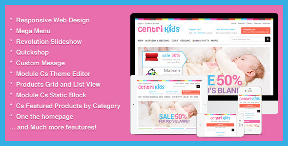 父母始终保持最好的东西为他们的孩子。正在为所有的父母一个值得信赖的地方,是一个成功的儿童保健业务的好方法。 CentriKids收集所有必要的功能,是家长经常重新访问电子商务网站。这将是一个伟大的助手,以提高您的销售,品牌和声誉。它是专门设计来吸引不仅是父母的注意,但也是孩子们的。颜色和纹理巧妙地结合起来,以提供一个优质的购物的家长和孩子。幻灯片大图,很好的过渡,并为宣传内容惊人的经济效应显示出来的,没有人可以忽视一个露天的地方。