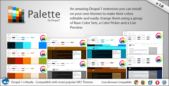 调色板是一个了不起的Drupal 7扩展可以安装在你自己的主题使其颜色可编辑和容易改变他们使用的一组基颜色设置,颜色选择器和实时预览。注意:注意这是主题开发的扩展和安装它并´只是复制粘贴。认真阅读安装说明文档描述。