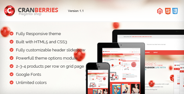 Cranberries – 是一种优质的响应和视网膜适用于任何种类的商店准备Magento的主题。兼容的Magento:1.8.xx(1.8.0.0),1.7.xx(1.7.0.0,1.7.0.1,1.7.0.2)