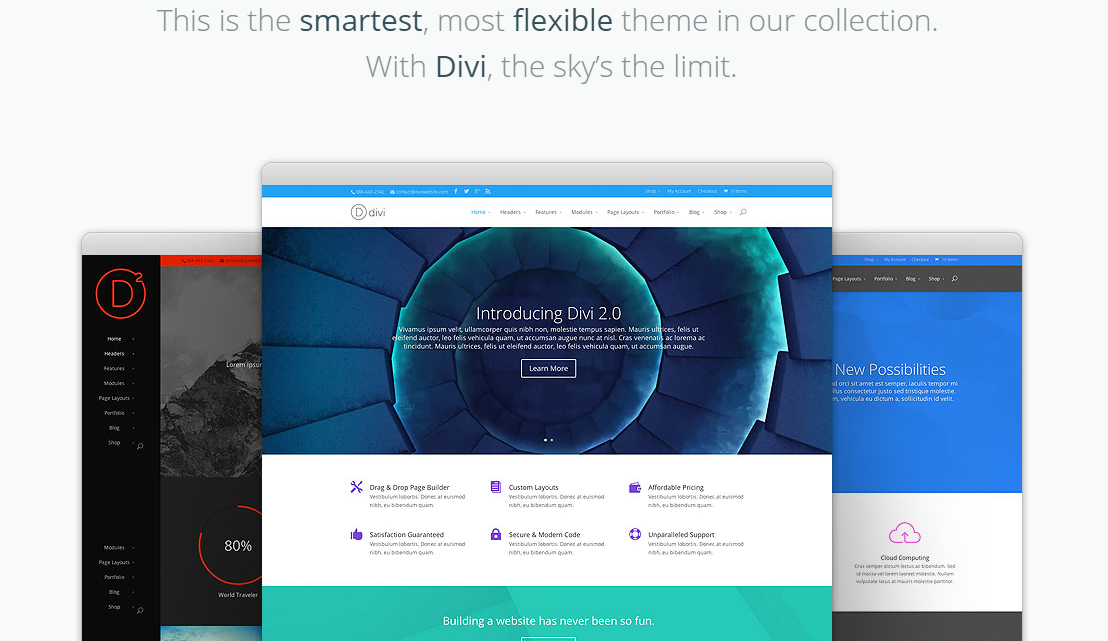 官方解释说:This is the smartest, most flexible theme in our collection. With Divi, the sky’s the limit.