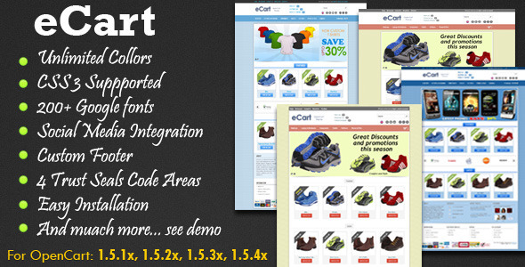 eCart主题是一个灵活的,功能丰富,独特的现代通用opencart主题。它是完全建立一个新的模块称为偏差的控制面板,你可以用它来管理等主题的颜色特征(文本,链接,徘徊和背景),字体(标题,正文,菜单的链接等),背景纹理,支付图标,信任(安全)密封件为自定义页脚。