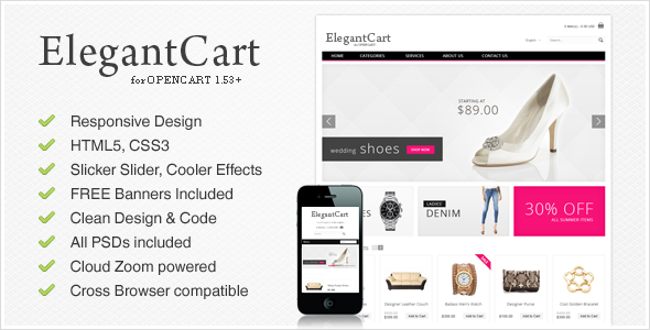 elegantcart是敏感的,完全可定制的opencart主题它具有极好的,清洁的和巧妙的设计,为各种各样的产品是合适的。这是很容易安装和定制。它包含所有的设计元素,在模板中的PSD文件的船舶6自由的旗帜,大量(滑块的图像),24的背景图案和一个主要的颜色和背景颜色选择器控件导航。elegantcart带有3个额外的模块,它使用jQuery库,cloudzoom,jQuery的旋转木马,谷歌网页的字体和更为愉快,功能详尽的用户体验。它是搜索引擎友好的和跨浏览器兼容,是基于opencart 1.531 +和将支持未来的版本以及!