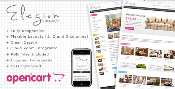 Elegium是一个高级,响应OpenCart电子商务主题,用干净和利落的设计风格。这是完美的任何类型的网络店铺。 Elegium让您轻松1,2或3列之间进行选择。它看起来很棒所有类型的设备(笔记本电脑,平板电脑和手机)。打开演示站点和调整浏览器窗口。