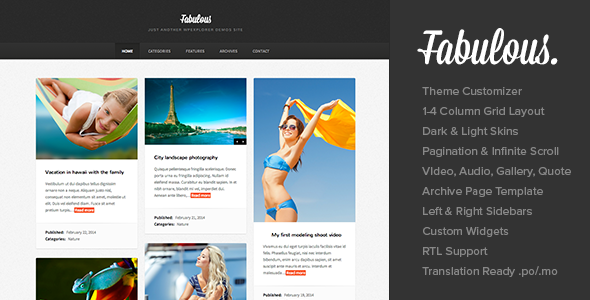 Fabulous是一个现代砌体摄影博客的主题是一个典型的风格,是永不过时的。完美的博客写手,摄影师,设计师,开发商和更多的主题聚焦在你的内容(如需要)。使用它作为一个博客或组合!