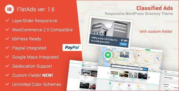 FlatAds v1.6是优质的目录/上市的WordPress主题,超级灵活,充分响应设计(试着调整你的浏览器)。HTML5和CSS3和建。很多思想和保健投入flatads使它使用乐趣。该flatads是WooCommerce兼容2.1,bbPress,WP插件MailChimp。