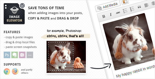 WordPress的图像电梯可以粘贴图像编辑器后,直接从剪贴板(或通过拖拽文件)!换句话说,你可以粘贴图像直接从您最喜爱的图形编辑或任何屏幕捕捉程序。只是拷贝和粘贴。更重要的是您可以重命名和压缩后的图像粘贴。
