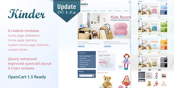 Kinder是一种美丽的视觉,技术先进,opencart主题。这是4的配色方案(蓝色的凉爽,黑色和优雅,充满活力的绿色,橙色和温暖),你可以选择一个适合你的口味。设计是干净的和有吸引力的,这是挤满了一些不错的jQuery的效果使你的顾客更好的购物体验。我们认为这是一个美丽的主题,将与任何类型的商店工作,特别是那些网上卖衣服,儿童用品,化妆品,美容产品,香水,家具,珠宝和手表。