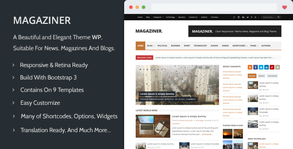 主题杂志是一个完全响应主题看上去很棒的任何设备和任何尺寸和支持视网膜。包括许多功能的幻灯片,选项面板,自定义控件,自定义简码,多侧边栏,许多自定义的模板和布局的博客和更多。主题杂志适合杂志,新闻网站和博客。