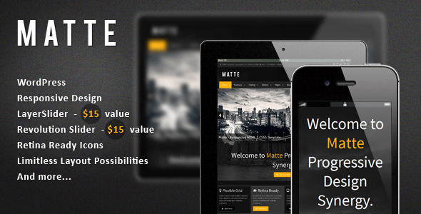 Matte是企业响应的WordPress主题。它是跨浏览器兼容,那么它将手机在智能手机看起来很棒,平板电脑以及笔记本电脑和台式显示器。磨砂使用谷歌等网站字体排版将看起来是你想让它。它配备了几家页选项包括惊人的layerslider和革命的滑块。结合一个价值30美元的。