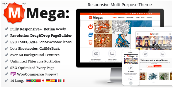 Mega WordPress主题,是一款企业、购物商城、案例展示主题,主题特点:自适应&视网膜支持,宽和窄布局,干净时尚用户友好的设计,无限颜色,4个页眉样式,520+字体,360+图标,Revolution 幻灯片、作品、文章幻灯片、内容滑块,固定菜单(开/关),侧边栏生成,无限可筛选的作品展示,子主题支持,前端包括简体、繁体中文多国语言文件等。