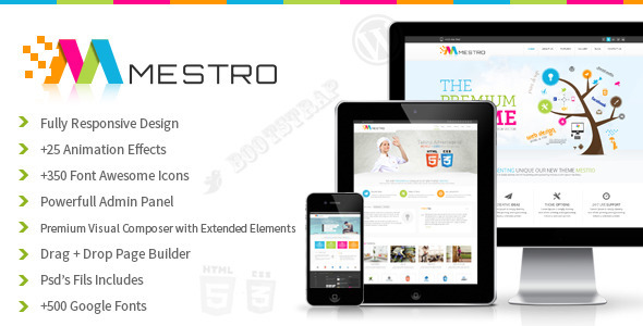 Mestro是丰富多彩的,动画和多功能响应的WordPress主题。您可以自定义,并具有强大的可视化编辑和管理面板轻松地创建页面。它易于安装,并包含演示内容,让你编辑拖放页面生成器。 7种不同类型的旗帜风格