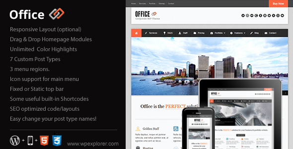 Office,对于任何企业的经营。拥有一个非常专业的设计,自定义7种后,拖放网页模块,无限的高亮颜色选项,选装的导航图标,3个菜单区,一个可选的响应布局…办公室有您需要为您的企业网站的一切。
