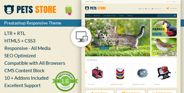 Pet Store Prestashop响应主题是专为宠物,动物和食品商店。宠物商店的Prestashop响应主题是好看与它的颜色组合。所有子页面定制。这是非常好的以其干净,专业的外观。