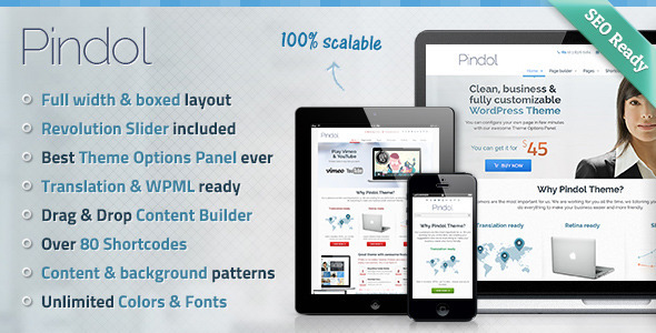 Pindol是惊人的,完全完整的主题。你可以选择,如果你想盒装或全宽度的布局。您也可以选择图案的内容和背景,或成立自己的形象。所有paterns被纳入主题,所以一切都准备就绪。即使你不要想创建自己的网页,我们为您提供的解决方案。我们为我们所有的客户提供xml档案,只是把它上传到主题后,你会得到完全一样的页面,我们的演示。