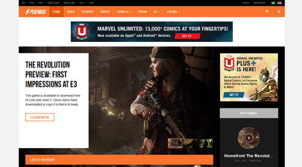 JA Playmag是一个多才多艺的响应的Joomla模板在线游戏杂志和支持Joomla 3与Joomla 2.5。是的playmag还支持RTL布局,K2组件和kunena论坛。