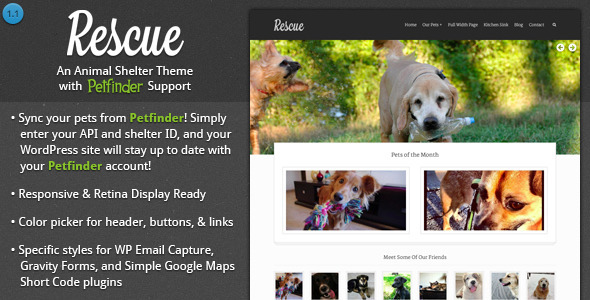 Rescue是建有一个目的主题:通过获得的动物。而在好的方面来说,你的庇护,现在有一个真棒看的网站。宠物可以轻松添加,或者您可以从您的Petfinder个人资料点击几下拉他们。