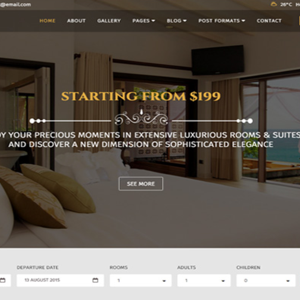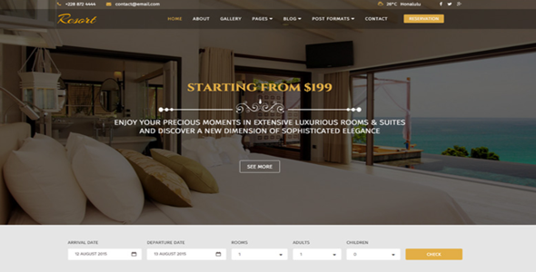 这个模板专注于精美展示您的酒店或度假村的最佳功能。 网站建成一个在线预订网站。现在,您的客户可以查看实时可用性,定价,