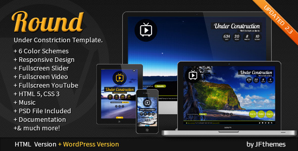 Round 是一个独特的,干净的,反应灵敏,全屏倒计时/预告/在建/在简约风格等待一个网页的迷你网站模板。菜单动画效果。高分辨率Retina显示屏就绪。
