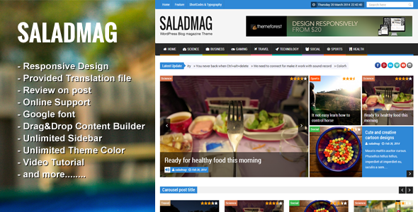 saladmag是优质的WordPress主题,清洁和充分的应答杂志。这个主题是有用的拖放内容生成器,主题选项,审查制度,自定义工具栏,定制的背景和更。