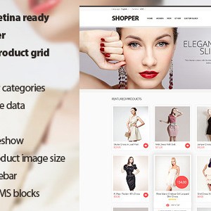 Shopper- 是一个非常强大和灵活的保费Magento的主题与响应与视网膜准备好设计。这次的主题是适合任何类型的商店,并配备了大量的真棒功能,如:AJAX价格滑块,自定义网格模式,革命滑块,快速安装包及以下等只需点击功能列表。
