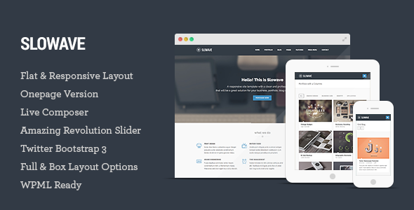 slowave是一个平坦的响应的WordPress主题,用干净的和专业的设计将为您的企业,一个伟大的解决方案组合,博客或任何其他目的网站。slowave是可怕的推特引导V3建造,拥有一个美丽的前端页面生成器,无限的色彩组合,充分整合与谷歌字体的字体控制。