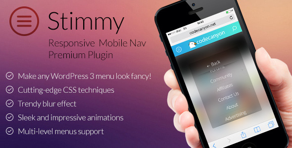 stimmy是优质的WordPress插件,使用你的主题的标准菜单源产生反应的导航菜单(见要求)。导航的用户体验和stimmy非常重要的部分,使它更容易为小屏幕。它采用先进的CSS3技术像整个页面的模糊效果(回退如果模糊是不支持)和各种动画菜单。在iOS,Android和Windows Mobile设备黑莓,如果浏览器支持所需要的功能,如果没有就不会产生