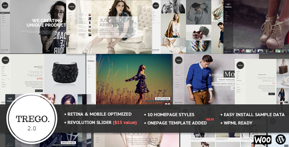 Trego v2.0 是一个溢价WordPress的全屏/ WooCommerce与先进的管理模块的主题。这是高度可定制的,易于使用的和充分的应答。适用于各型商店。至于你的自定义项目的出发点大。使用的–WordPress的主题,你可以很快地展示他们的最好的产品和品牌在主网页作为一个美丽的全屏模式。移动设备上是非常漂亮的。
