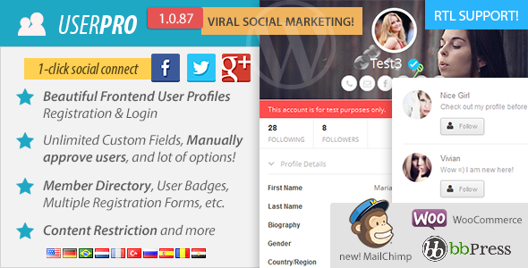 userpro是除了漂亮的用户配置文件的许多额外的功能,登录和注册,会员名录。它提供了社会联系和整合(1单击“自动注册/登记),病毒性营销,用户徽章,文件上传,上传图片和视频灯箱的支持,响应,跟随/ unfollow用户,验证账户,内容限制(私人的内容),前端的出版商,职位由用户,公共/私人活动的饲料,和更多。这就是为什么userpro–给你比前端剖面和WordPress的登记制度,它只是一插件!(看下面的详细特征)