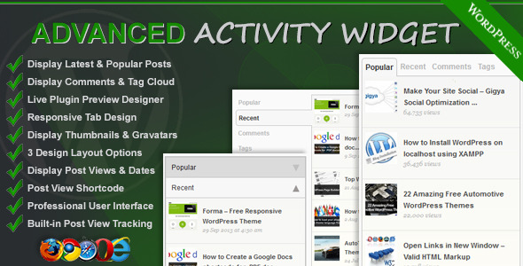 先进的活动Widget是高度可定制的,并可以显示无限量的文章,评论和标签。