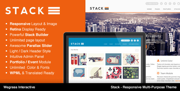 Stack是一种清洁,灵活,反应在布局图像(在不同的分辨率和布局减少加载时间对小显示器提供不同的图像大小)和完全支持视网膜显示屏。主题的后端采用全新的“堆栈生成器”,完全支持多语言插件WPML。