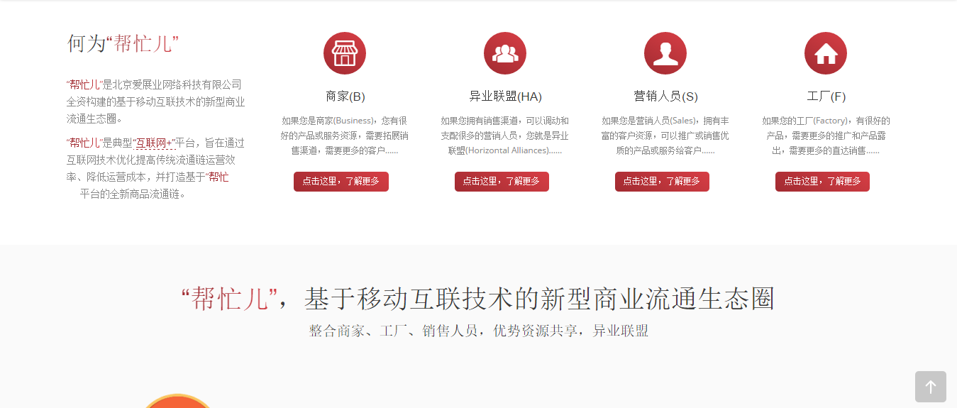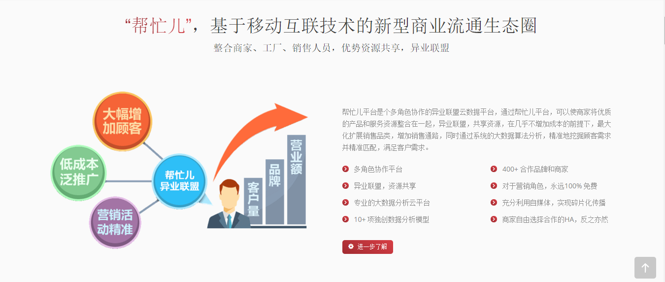 上一个下一个帮忙儿 | 基于互联网+的异业联盟平台“帮忙儿”是北京爱展业网络科技有限公司全资构建的基于移动互联技术的新型商业流通生态圈。 “帮忙儿”是典型“互联网+”平台,旨在通过互联网技术优化提高传统流通链运营效率、降低运营成本,并打造基于“帮忙儿”平台的全新商品流通链。 2015年11月15日响应式企业网站 新浪微博分享到新浪微博腾讯微博分享到腾讯微博人人网分享到人人网QQ空间分享到QQ空间开心网分享到开心网微信分享到微信