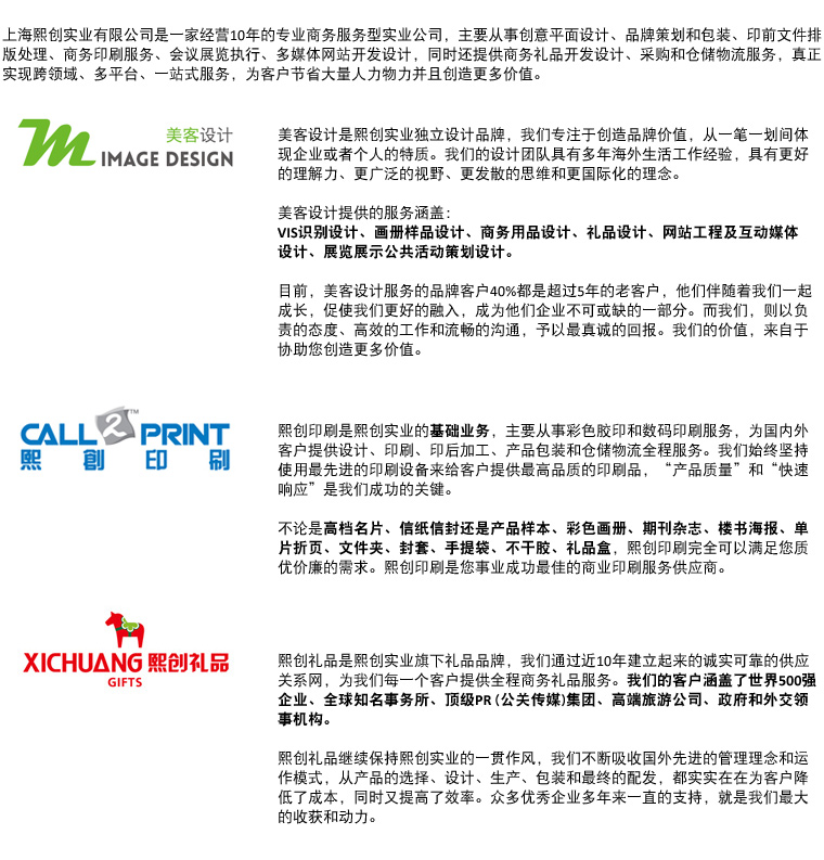 上一个下一个上海熙创实业(印刷)有限公司上海熙创实业(印刷)有限公司,非常给力的一家业务涉及国内外印刷业的企业,官网改版项目由芊雅企服 – 企业服务平台 完成。 上海熙创实业(印刷)有限公司是一家经营10年的专业商务服务型实业公司,主要从事创意平面设计、品牌策划和包装、印前文件排版处理、商务印刷服务、会议展厅执行、多媒体网站开发设计、同时还提供商务礼品开发设计、采购和仓储物流服务,真正实现跨领域、多平台、一站式服务,为客户节省大量人力物力并且创造更多价值。 2015年12月24日响应式外贸网站 新浪微博分享到新浪微博腾讯微博分享到腾讯微博人人网分享到人人网QQ空间分享到QQ空间开心网分享到开心网微信分享到微信
