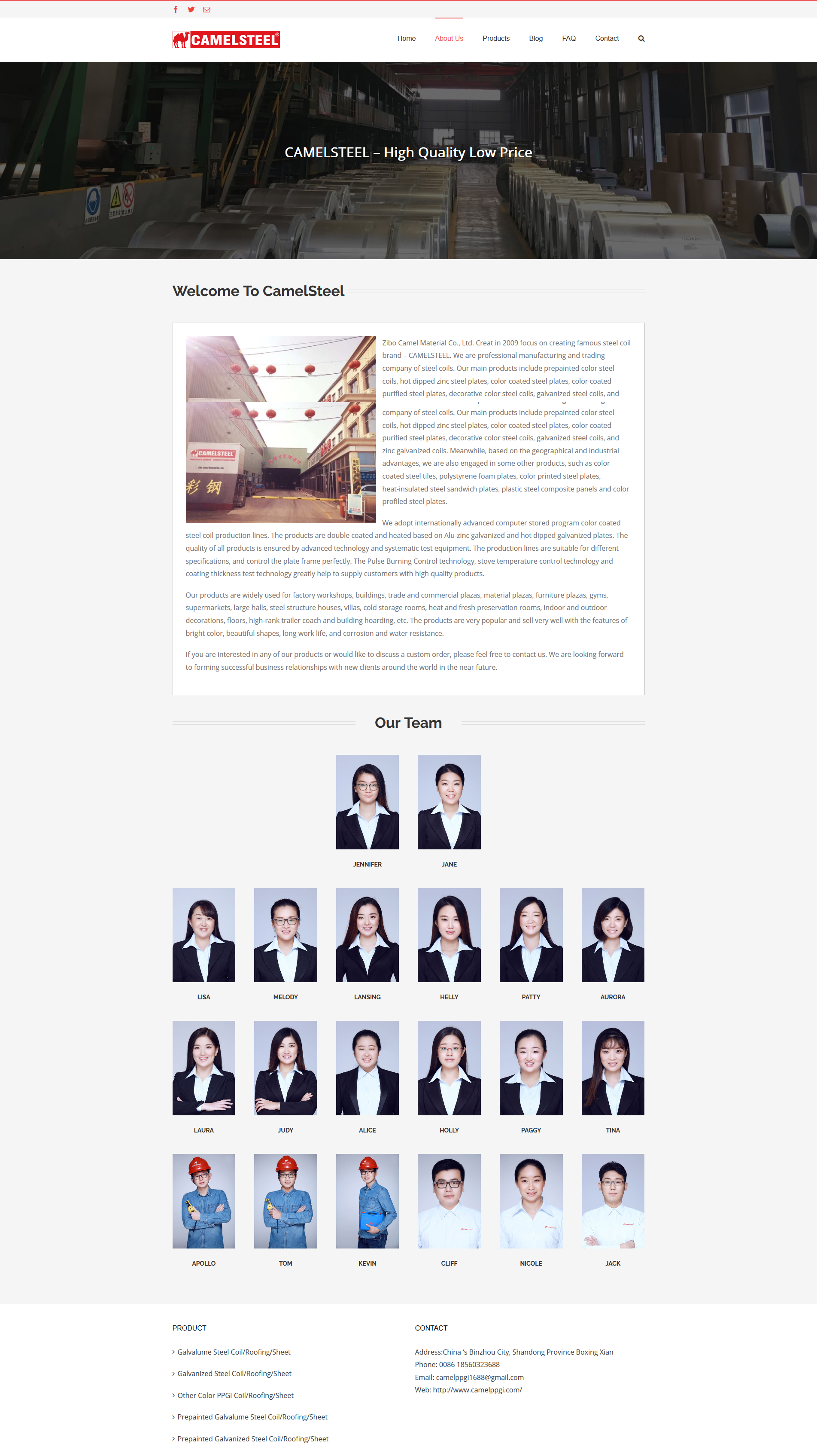 PrevNext淄博骆驼材料有限公司淄博骆驼材料有限公司成立于2009年,公司致力于打造名牌钢卷品牌 – CAMELSTEEL。我们是专业的钢卷制造和贸易公司。我们的主要产品包括预涂彩钢卷,热浸镀锌钢板,彩钢板,彩色镀锌钢板,装饰彩钢卷,镀锌钢卷,锌镀锌卷。同时,根据地理和产业优势,我们还从事其他一些产品,如彩涂钢瓦,聚苯乙烯泡沫板,彩色印刷钢板,隔热钢夹芯板,塑钢复合板和彩色钢板。 2017年5月2日响应式外贸网站