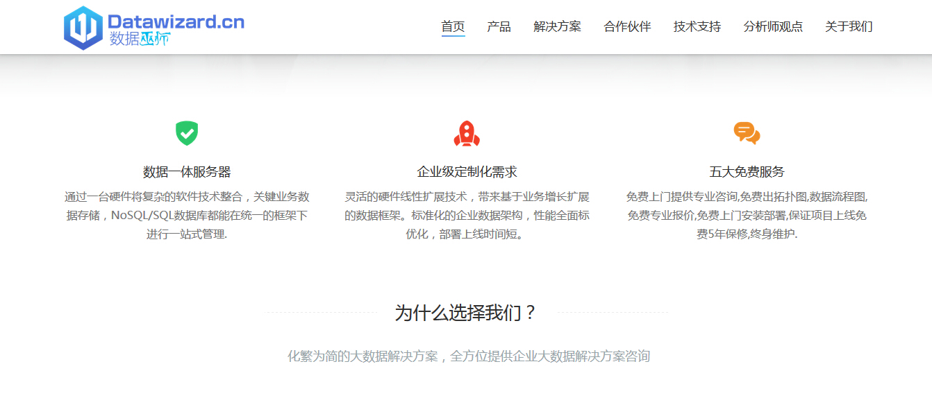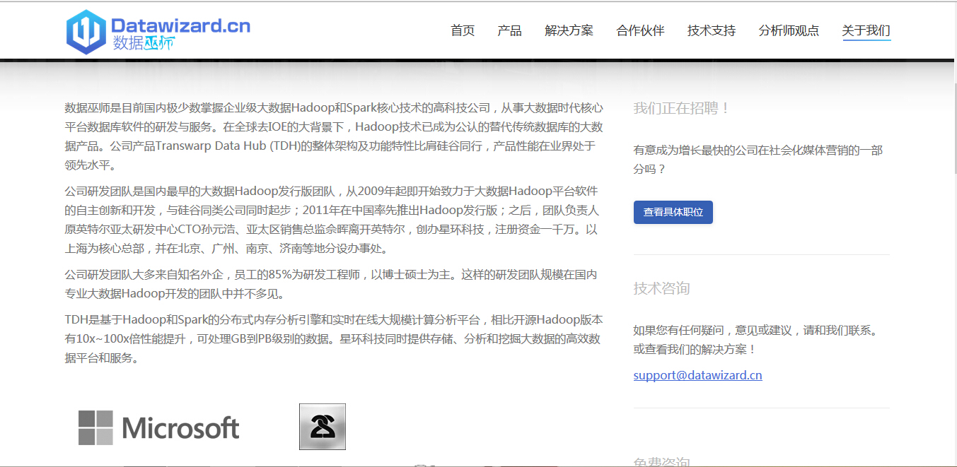 数据巫师是目前国内极少数掌握企业级大数据Hadoop和Spark核心技术的高科技公司,从事大数据时代核心平台数据库软件的研发与服务。 在全球去IOE的大背景下,Hadoop技术已成为公认的替代传统数据库的大数据产品。公司产品Transwarp Data Hub (TDH)的整体架构及功能特性比肩硅谷同行,产品性能在业界处于领先水平。