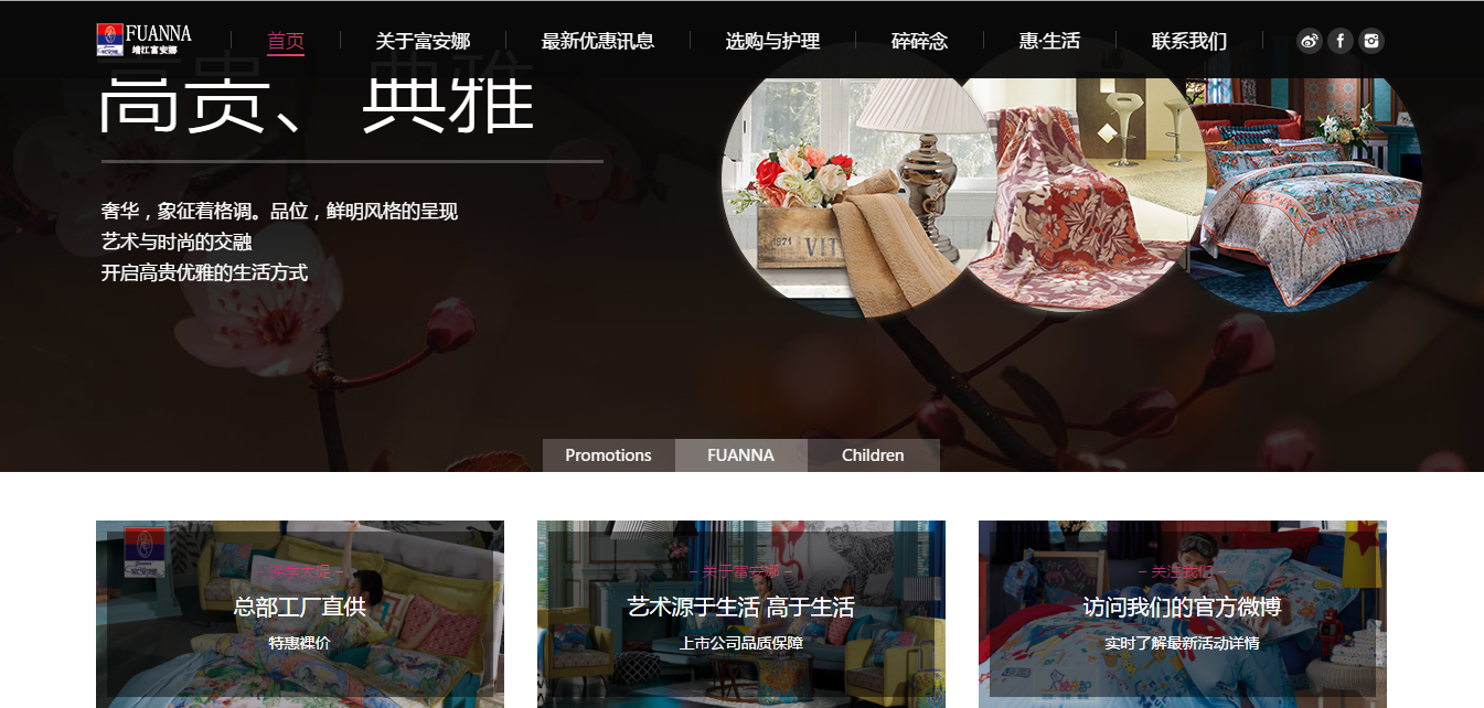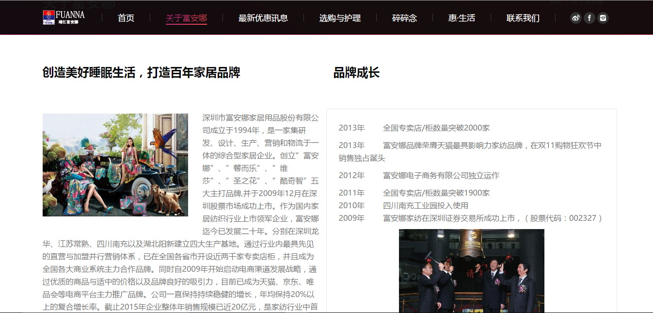 上一个下一个靖江富安娜艺术家纺官网深圳市富安娜家居用品股份有限公司成立于1994年,是一家集研发、设计、生产、营销和物流于一体的综合型家居企业。创立”富安娜”、”馨而乐”、”维莎”、”圣之花”、”酷奇智”五大主打品牌,并于2009年12月在深圳股票市场成功上市。作为国内家居纺织行业上市领军企业,富安娜迄今已发展二十年。分别在深圳龙华、江苏常熟、四川南充以及湖北阳新建立四大生产基地。 2016年5月24日响应式企业网站 新浪微博分享到新浪微博腾讯微博分享到腾讯微博人人网分享到人人网QQ空间分享到QQ空间开心网分享到开心网微信分享到微信