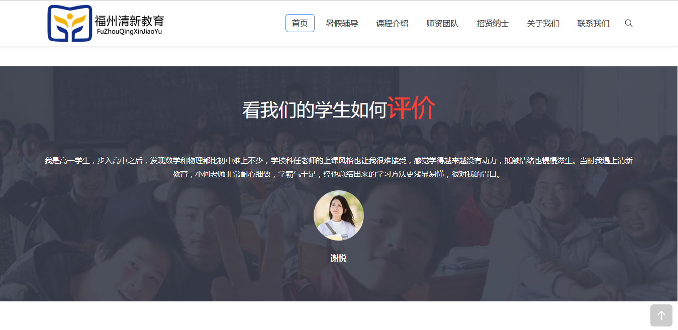 上一个下一个福州清新教育福州清新教育源于一群热衷于公益事业的师范院校应届生于2011年创立,迄今为止已免费为300个以上的贫困家庭免费补习150课时以 上,共计约45000课时,已服务仓山、晋安、马尾、鼓楼、台江等多个区域,欲打造“清新福州,文化榕城”的半公益教育第一品牌。教 师团队主要由师范大学研究生团队组成,由大学导师亲自指导。 2016年7月18日响应式企业网站 新浪微博分享到新浪微博腾讯微博分享到腾讯微博人人网分享到人人网QQ空间分享到QQ空间开心网分享到开心网微信分享到微信