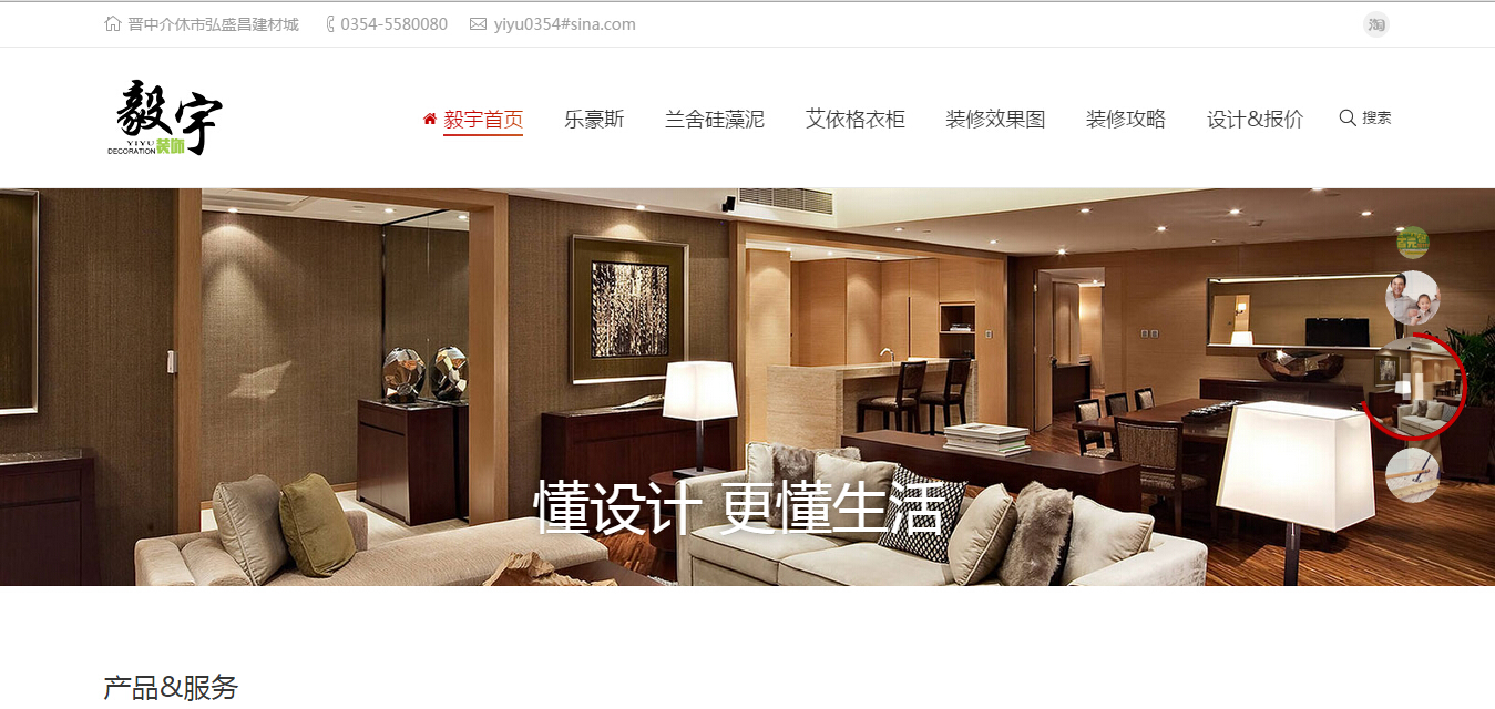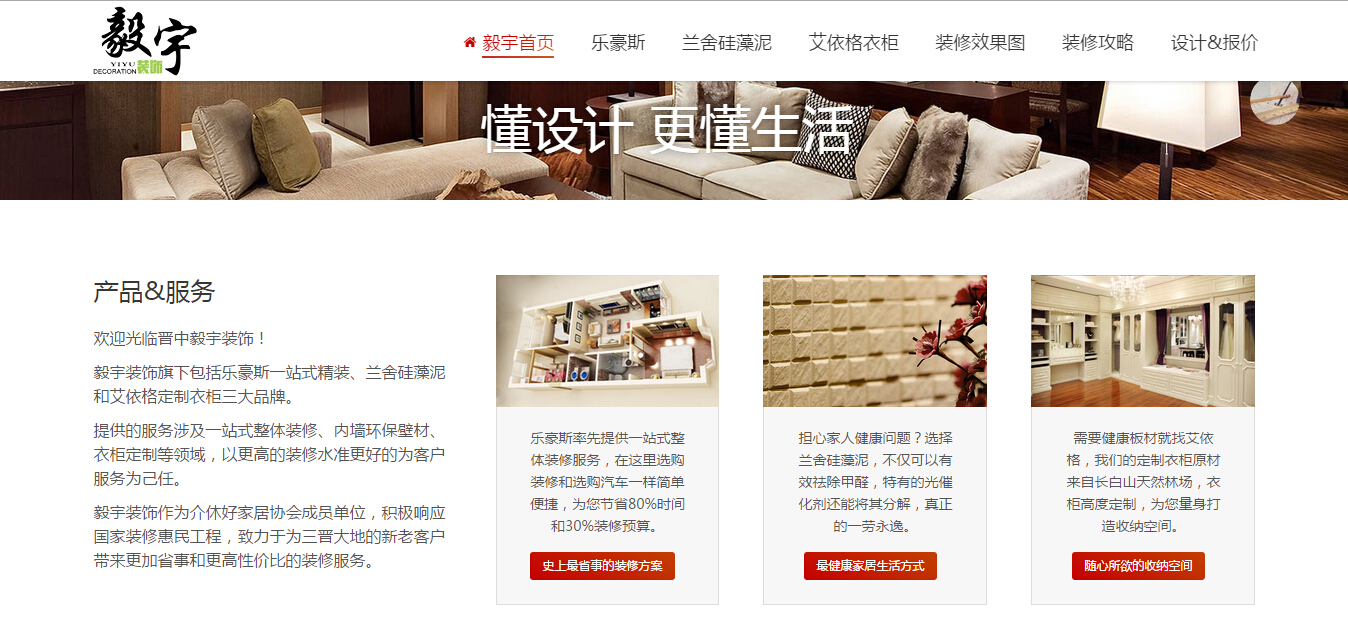 上一个下一个晋中毅宇装饰毅宇装饰旗下包括乐豪斯一站式精装、兰舍硅藻泥和艾依格定制衣柜三大品牌。 提供的服务涉及一站式整体装修、内墙环保壁材、衣柜定制等领域,以更高的装修水准更好的为客户服务为己任。 毅宇装饰作为介休好家居协会成员单位,积极响应国家装修惠民工程,致力于为三晋大地的新老客户带来更加省事和更高性价比的装修服务。 联系方式 电话:0354-5580080 地址:晋中介休市弘盛昌2号门 营业时间:9:00-18:00 2015年3月17日响应式企业网站 新浪微博分享到新浪微博腾讯微博分享到腾讯微博人人网分享到人人网QQ空间分享到QQ空间开心网分享到开心网微信分享到微信